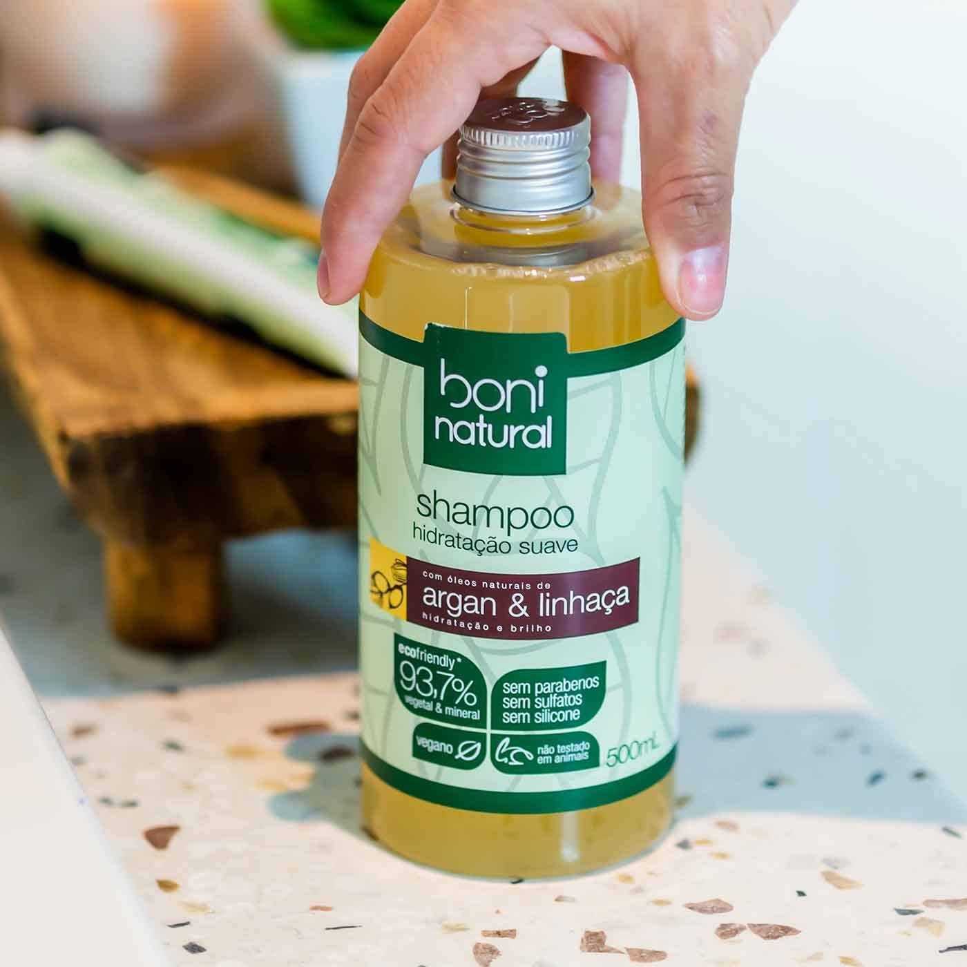 Especificação: Shampoo Vegano e Natural de Argan e Linhaça, Para todos os tipos de cabelo, Boni Natural, Transparente