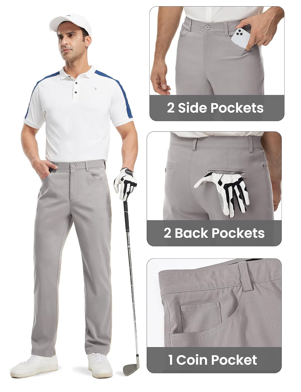 • 5 bolsos: 2 bolsos frontais (com 1 bolso para moedas) e 2 bolsos traseiros com botão, estas calças de negócios masculinas podem guardar itens essenciais como telefone, bolas de golfe, luvas, moedas ou chaves