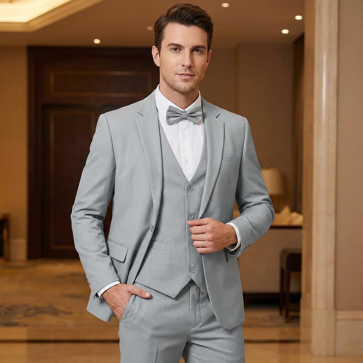 - Conjunto de terno masculino formal tudo-em-um: este terno masculino de 3 peças inclui um blazer de botão único, calça reta, colete com decote em V e gravata borboleta combinando. O terno masculino slim fit adota o mesmo tecido e cor para um visual formal unificado, pronto para usar fora da caixa — sem necessidade de acessórios extras para este terno de 3 peças para homens.