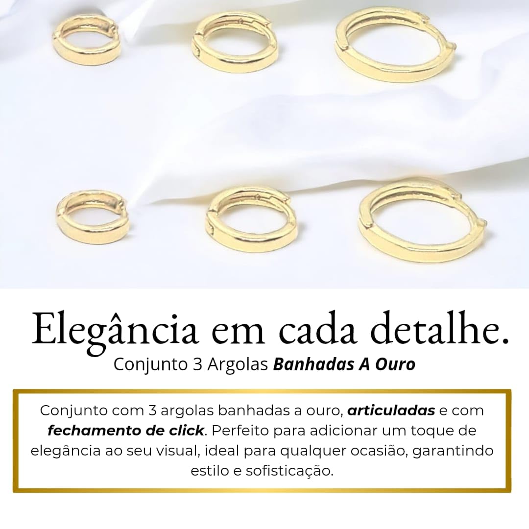 Trio de Brincos Argolas de Tamanhos Diferentes Para 1º, 2º e 3º furos Banhado a Ouro 18k