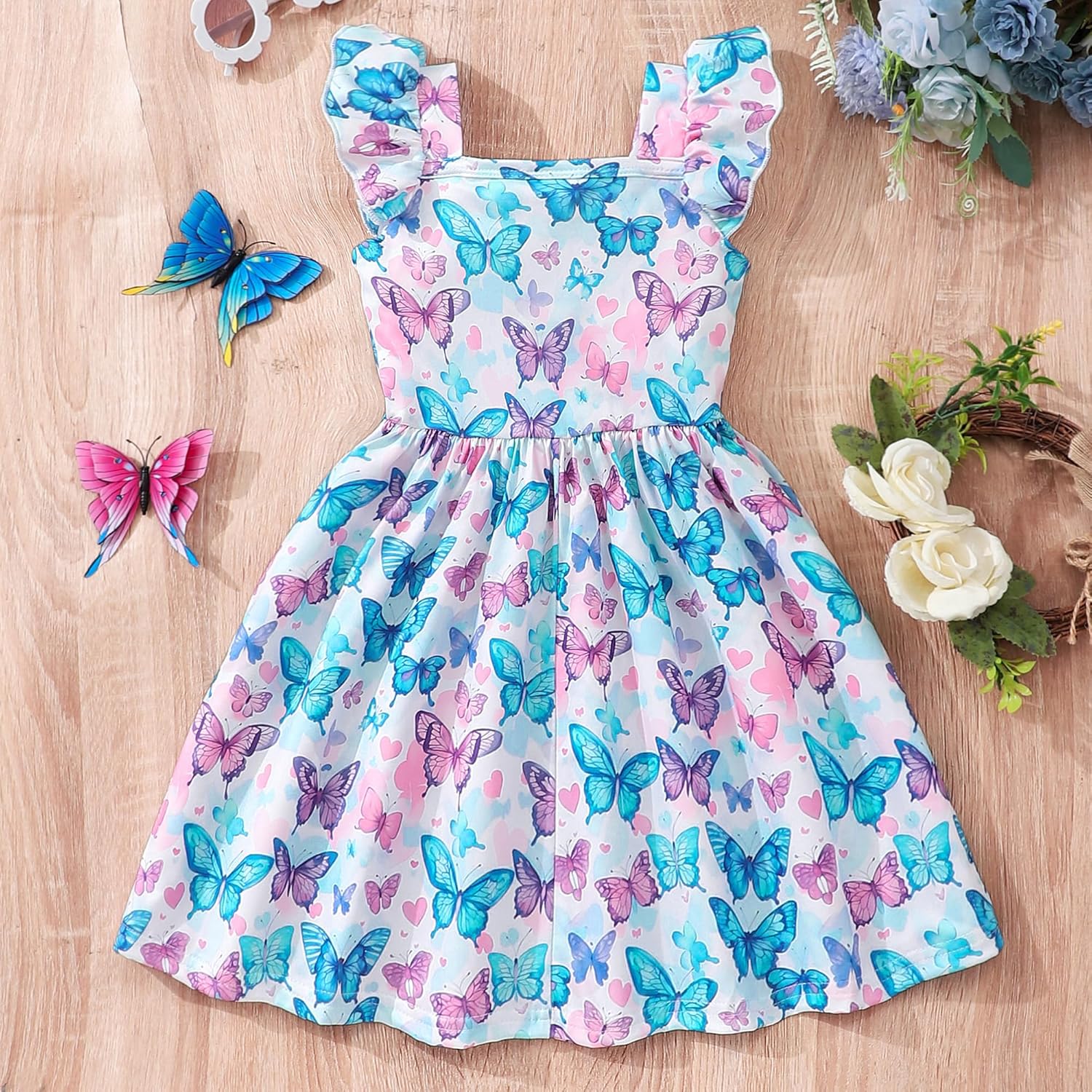 3 avaliações para Vestidos de verão para meninas, gola quadrada, babados, manga esvoaçante, para crianças pequenas, unicórnio, casual, evasê, rodado, 2-8 anos
