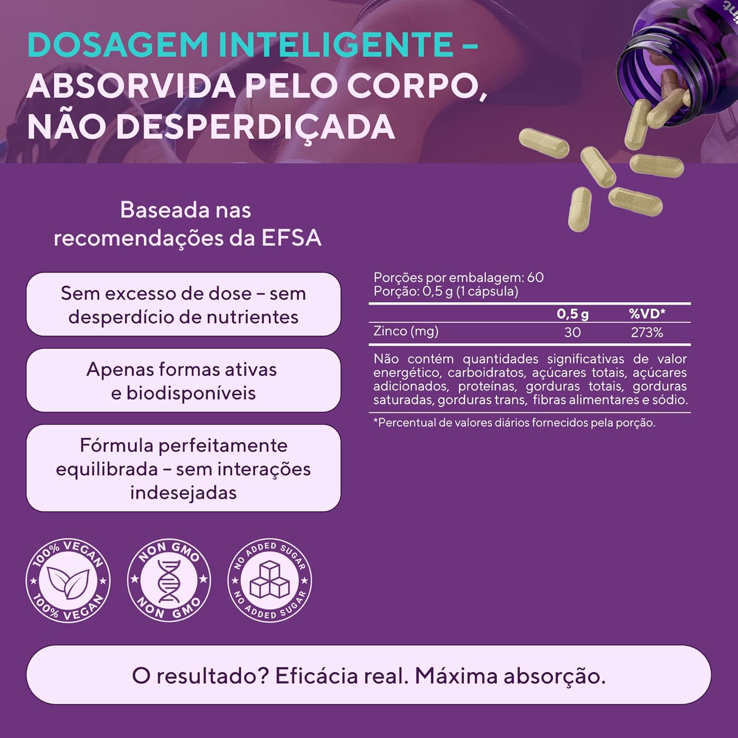 - 💊 ZINCO DE ALTA ABSORÇÃO – Cada cápsula contém 30 mg de zinco bisglicinato, forma quelada com melhor biodisponibilidade. Um suplemento vitaminico seguro e eficaz para homens e mulheres.